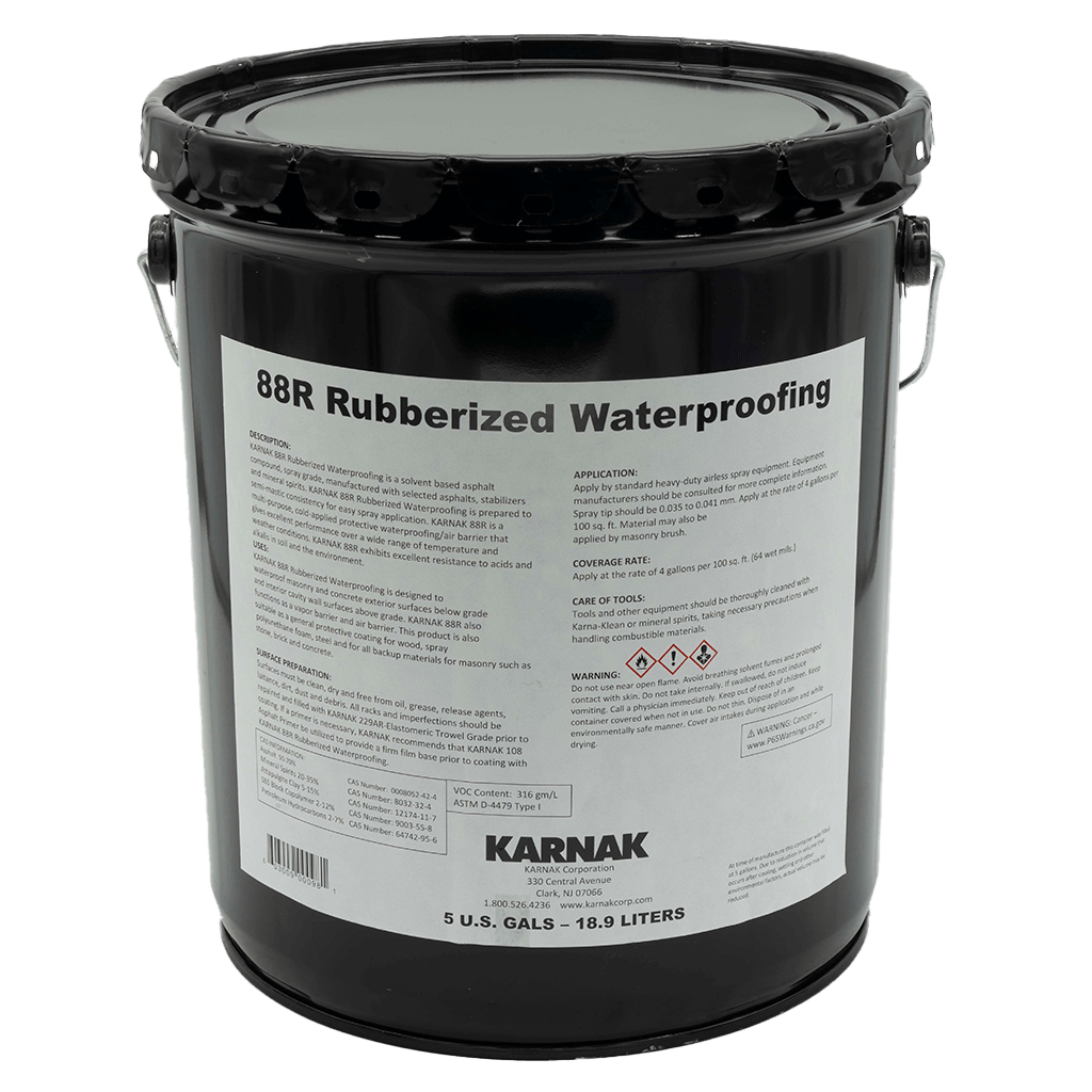 88R Rubberized Waterproofing is a solvent based elastomeric asphalt compound, manufactured with selected asphalts, stabilizers and mineral spirits.