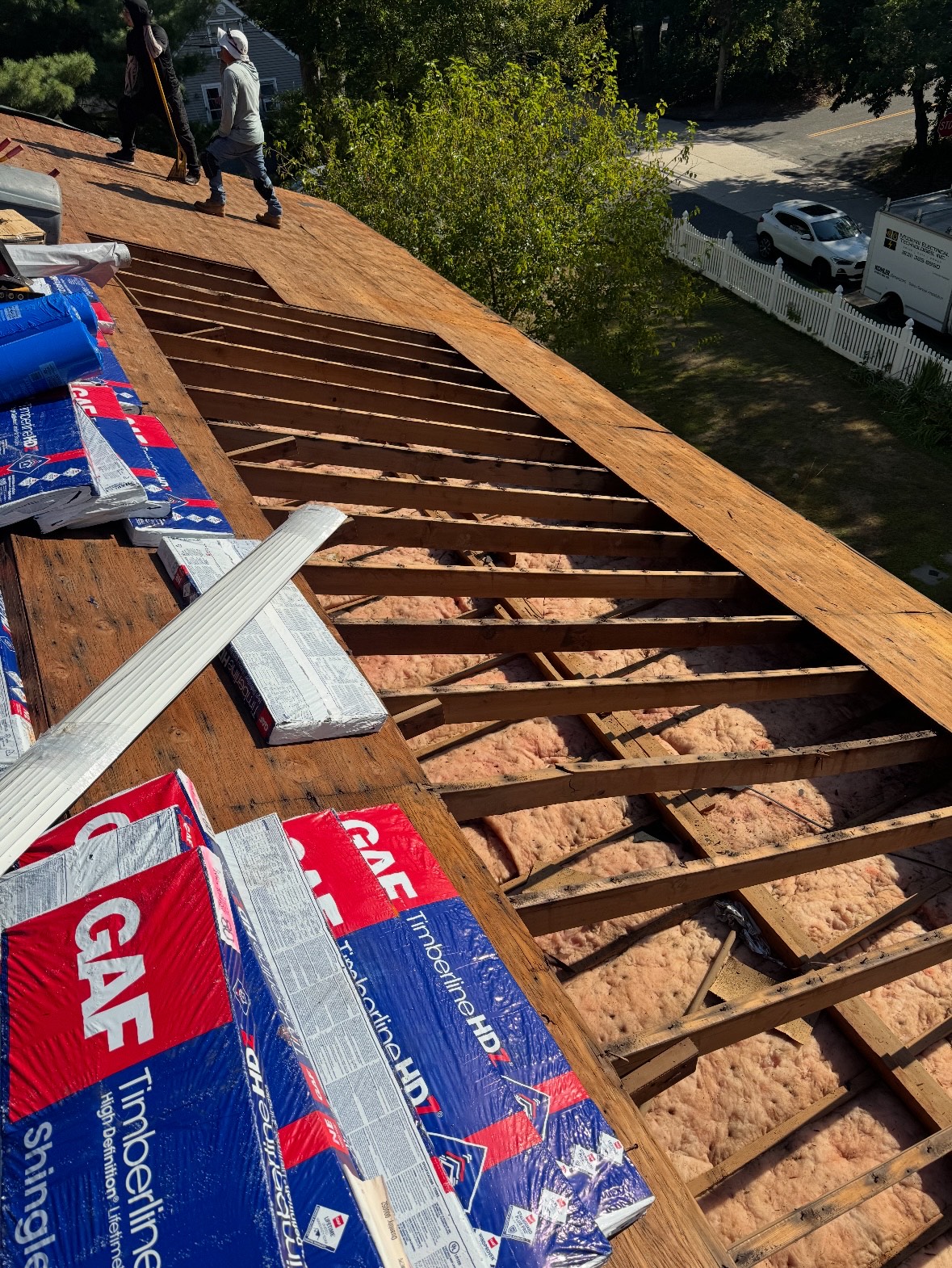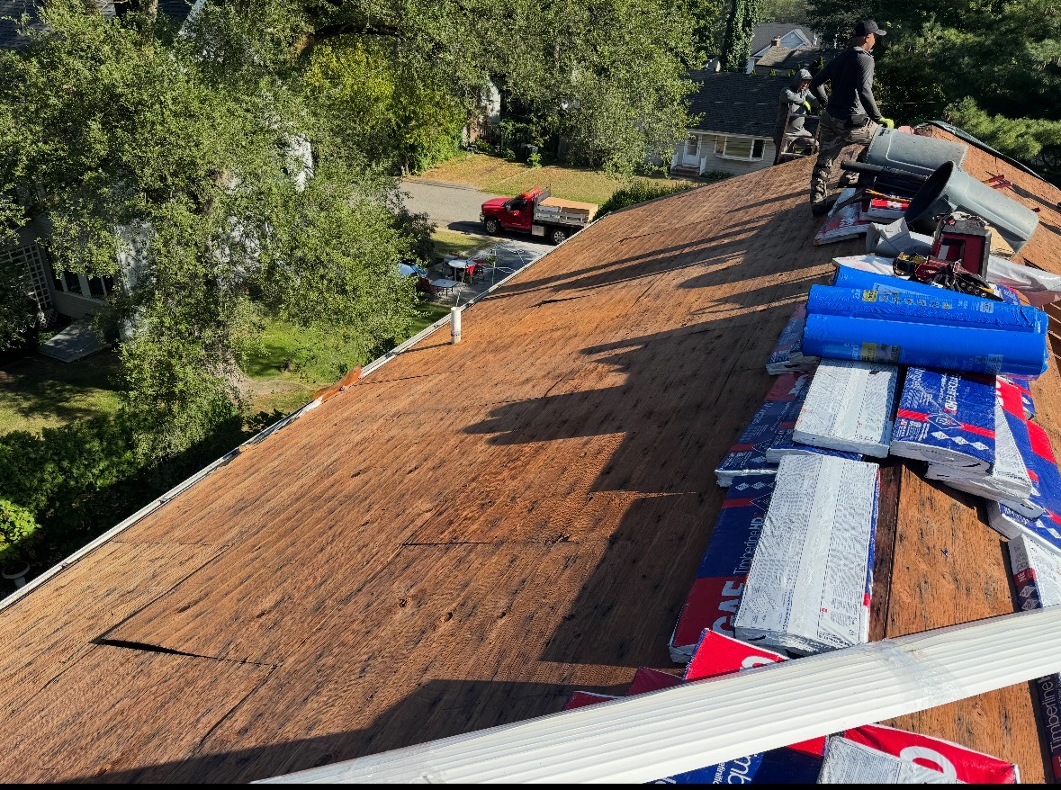 This two-layer roofing system had started to leak into one of the upstairs bedrooms which initiated the call to us for a repair. We found the second layer to be too old and brittle to effectively service and recommend a full replacement. Upon ripping the roof, we found excessive evidence of poor attic ventilation, causing premature failure of the plywood roof deck. Most of the nails holding the deck had popped and the boards were slowly dry rotting. We ripped the entire deck off the roof and replaced with new plywood which gave us a great, sturdy base to install our new GAF shingle system over top. We added ridge ventilation to the entire house to help prevent this problem from occurring again in the future. The house is now properly ventilated, high and dry, and under ours and GAF's leak-free-guarantee and warranty.