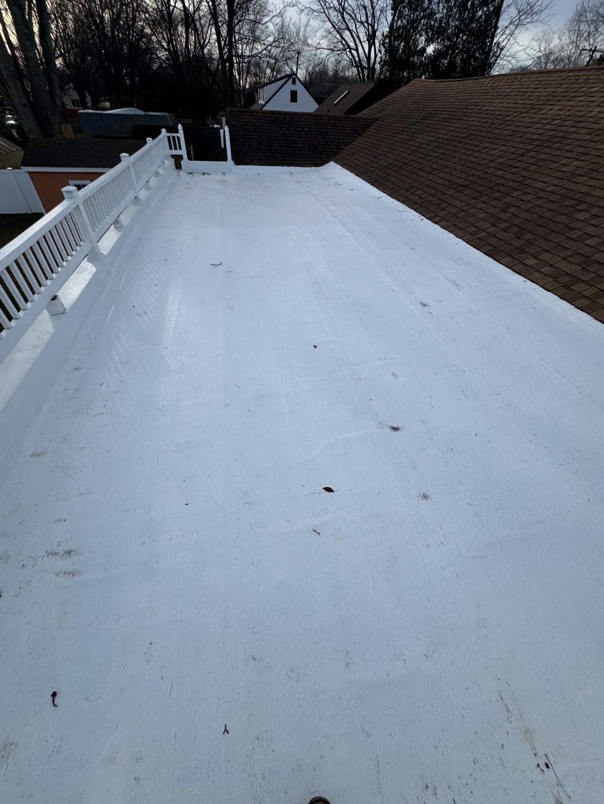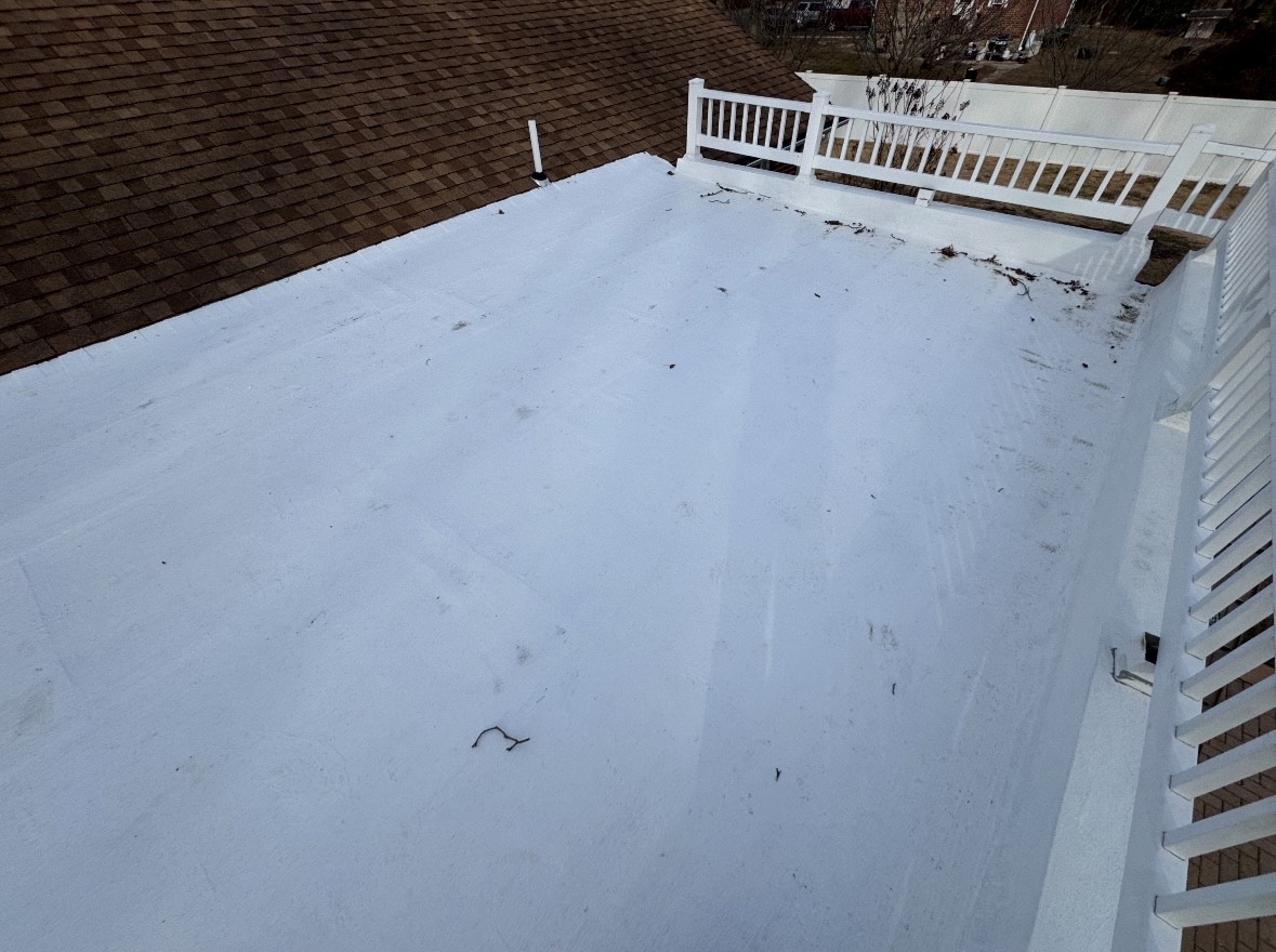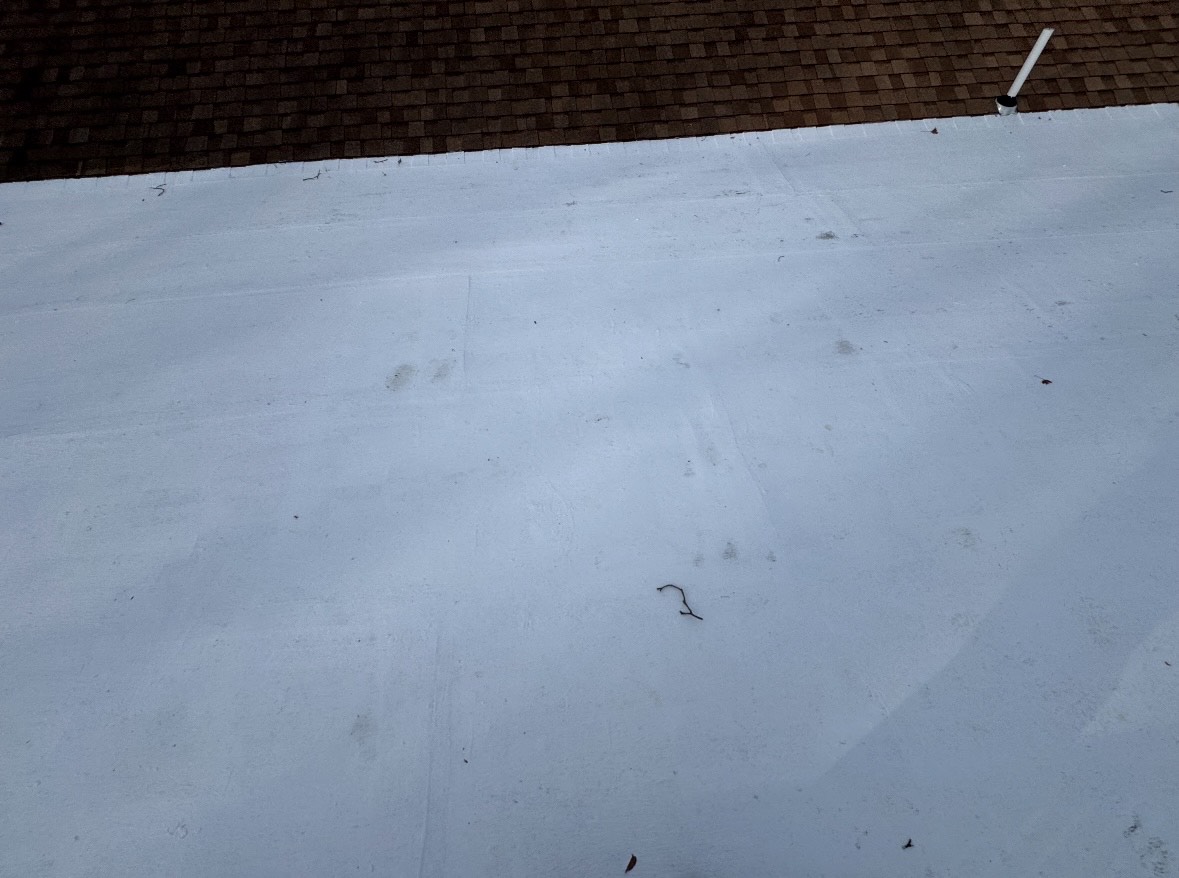 Silicone coatings are a great option for something even as small as a flat roof off the back of your house! This homeowner wanted piece-of-mind heading into the winter months that she wouldn't have any water intrusion with the forecasted snow this year. A heavy, GAF warrantied silicone coating was the perfect option for this small rear room on her house, leaving her high and dry and extending the life of her roof out another 20- years!