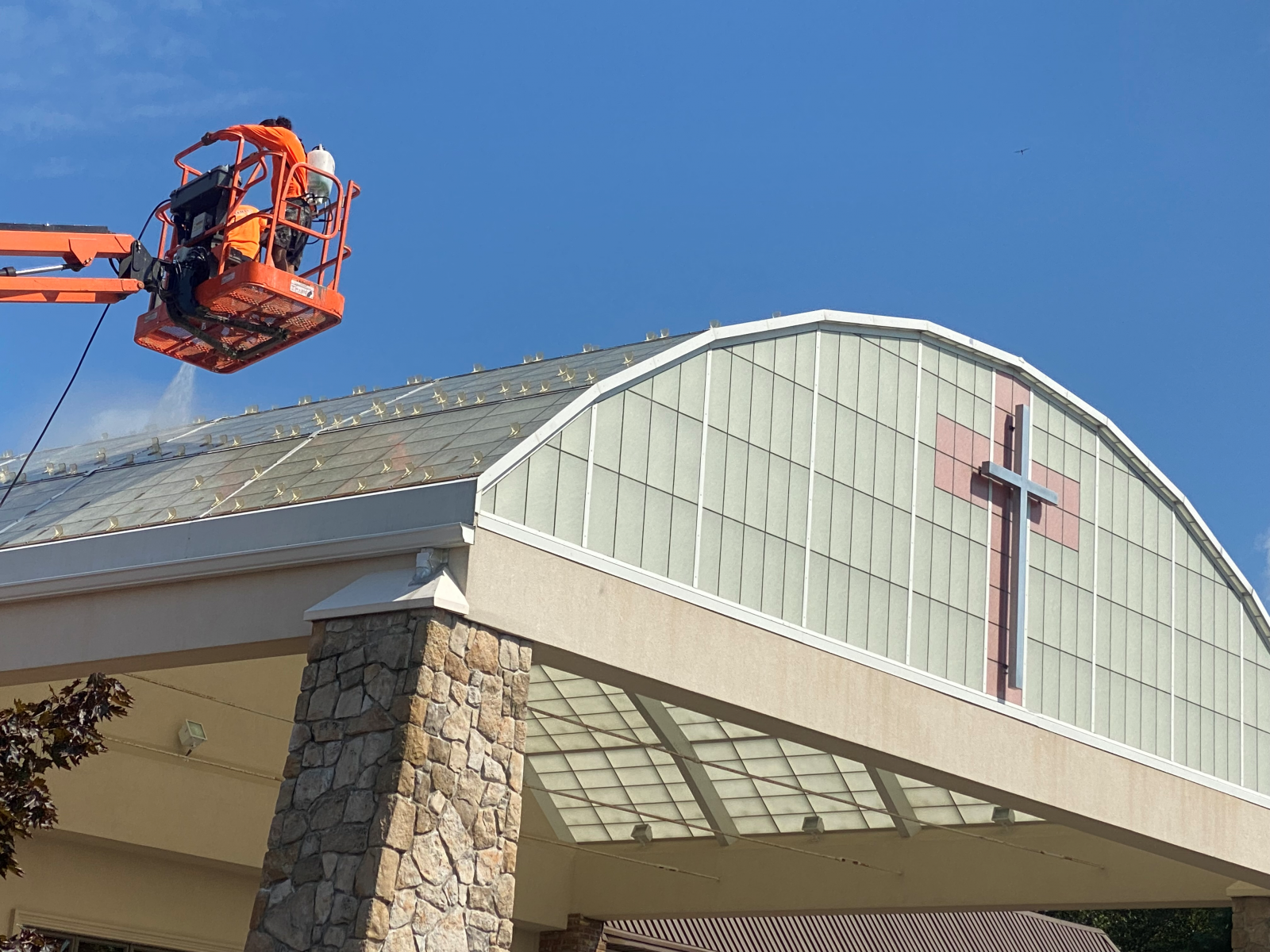 Another successful waterproof coating on a transparent portico for Island Christian Church in Northport NY
